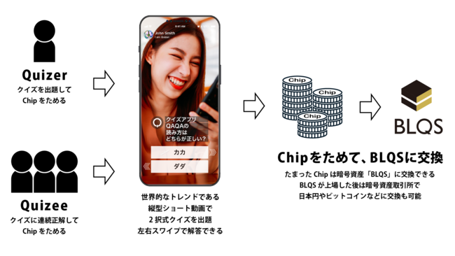 1. 世界的なトレンドである縦型ショート動画で2択式クイズを出題、左右スワイプで解答。 2. クイズ問題は、TikTokやYouTubeなどと同じユーザー投稿型。 3. クイズ解答者「Quizee」はクイズに連続正解するとゲーム内ポイント「Chip」がたまる。 4. クイズ出題者「Quizer」はクイズを出題すると「Chip」がたまる。 5. たまった「Chip」は暗号資産「BLQS」に交換できる。「BLQS」が上場した後は暗号資産取引所で日本円やビットコインなどに交換できる。 ※「Chip」は暗号資産ではありません。