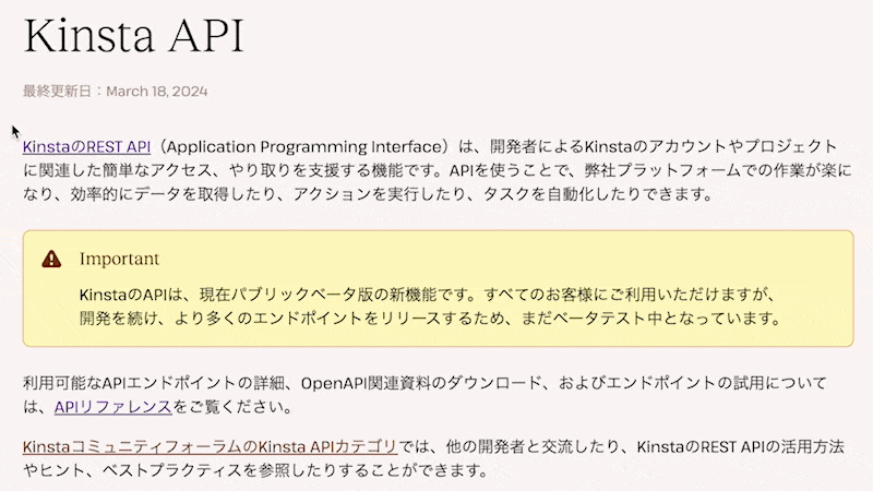 KinstaではAPIの継続的な開発とリリースを行っています。今後も随時ドキュメントの内容を更新し新たなエンドポイントを追加予定ですのでご期待ください。