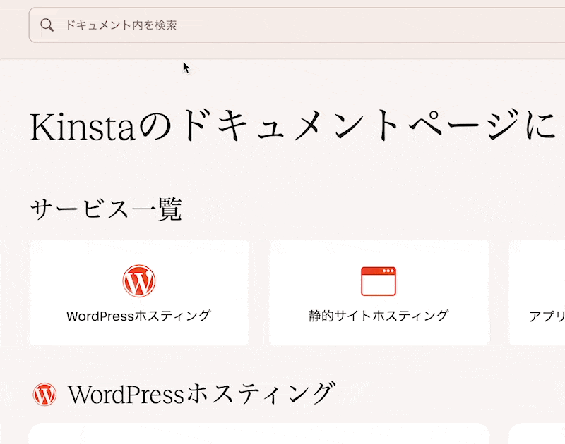 新しくなったKinstaドキュメントページでは、トップ画面から例えば、WordPress専用マネージドホスティング、静的サイトホスティング、アプリケーションホスティング、データベースホスティングなどをクリックするだけでそれぞれの詳細ページに素早く移動できます。