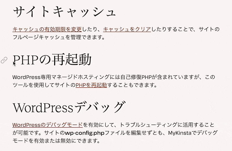 各カテゴリごとに(例えばWordPressのホスティングを選択した場合には)「ご利用開始にあたって」や「サイトの移行」「ドメインとDNS」「ステージング環境」などの各項目に左サイドバーからアクセス可能です。Kinstaを利用しての日々のサイト管理にまつわる疑問に答える情報を丁寧に盛り込み作り上げました。