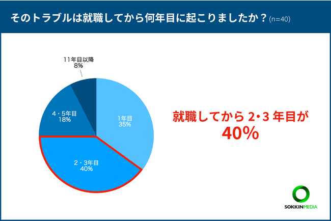 「特に印象的だったトラブルは就職してから何年目に起こりましたか?」という問いに対して、「就職してから2・3年目」が一番多く全体の40%を占めました。次いで「1年目」が35%と、若手の時に印象的なトラブルが起こる傾向があることがわかりました。