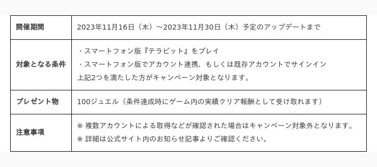 キャンペーン期間内にスマートフォン版『テラビット』をアカウント連携するなどの条件を達成した方、先着で1万名様に100ジュエルをプレゼントします。