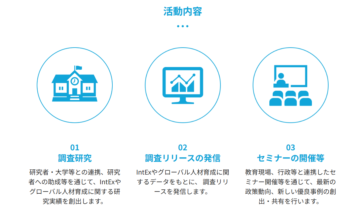 活動内容:まちなか留学基金の運営、企業/団体等とのコラボレーションによる子どもたちへの支援、国際交流や多文化理解等に関する調査・研究の実施(IntEx Lab)など
