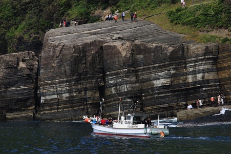 2018年9月に日本ジオパークに認定された須佐のホルンフェルス。2014年7月には大水害に見舞われた。今回、漁船の遊覧船に乗った外国人たちにこのランドスケープはどう評価されるのか?