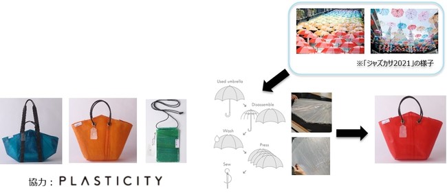 昨年のジャズカサ装飾で使用した傘は廃棄されるビニール傘からバッグなどを生産している「PLASTICITY」との連携でアップサイクリングされ、「サステナブルなバッグ」へ生まれ変わりました。