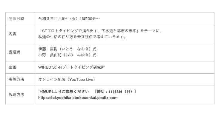 本プロジェクトの始動に当たり、『WIRED』日本版と「PARTY」が共同運営する「WIRED Sci-Fiプロトタイピング研究所」※によるサポートのもと、クリエイティブ集団「PARTY」クリエイティブディレクター伊藤直樹氏、SF作家の小野美由紀氏をゲストとしてお迎えしたオンライントークイベントを開催します。その後、ワークショップでは、小野氏とともに「SFプロトタイピング」の手法を用いて、未来視点による事業アイデアやものづくりの発想方法を学びます。