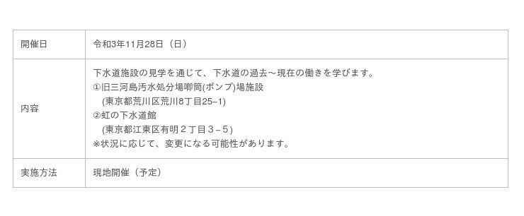 また、下水道施設見学を通じて、過去から現在における下水道の役割を体感できるフィールドワークも実施します。最終的に参加学生は、未来の下水道に関するアイデアを、イラストやグラフィック、小説などそれぞれが得意とする制作ジャンルで発表します。作品は当局の広報ツールとして活用し、広く発信していきます。