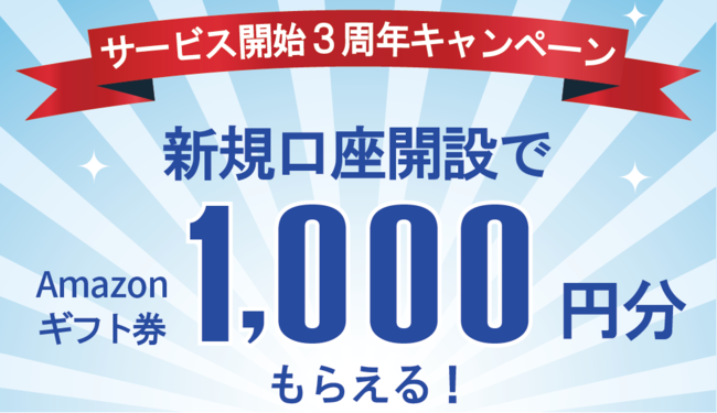 この度、ビットリアルティ株式会社は、サービス開始から3周年を記念して2022年1月14日(金)から、キャンペーン期間中に新規の口座開設が完了した方全員に、一律1,000円分のAmazonギフト券をプレゼントするサービス開始3周年記念キャンペーンを実施いたします。