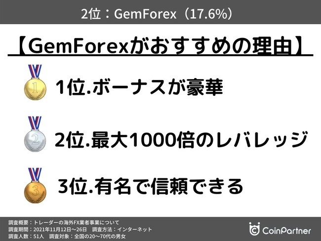 またおすすめランキング1位のXMの最大レバレッジが最大888倍なのに対して、GemForexは最大1000倍でトレードすることができます。その最大レバレッジの大きさもGemForexが使われている理由として多くの声がありました。GemForexが「有名で信頼できる」という理由で使っている方は、上位2つの理由よりも少なかったです。1位のXMが有名で信頼できるという理由で使い始める一方で、GemForexは全体的に提供しているサービスが理由で選ばれているようです。