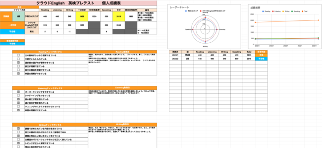 プレテストの結果をもとにそれぞれの技能の得意な所・苦手な所をまとめたシートが生徒様一人一人に送られます。