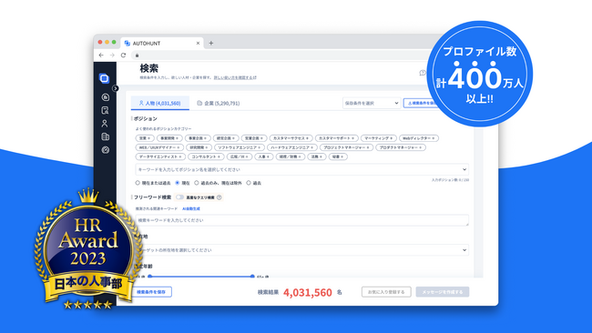 「AUTOHUNT」はウェブ上に分散している人材・企業情報を収集・統合し、優秀な人材を横断して検索できる、潜在層採用プラットフォームです。
