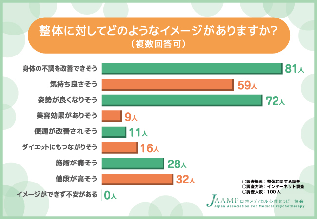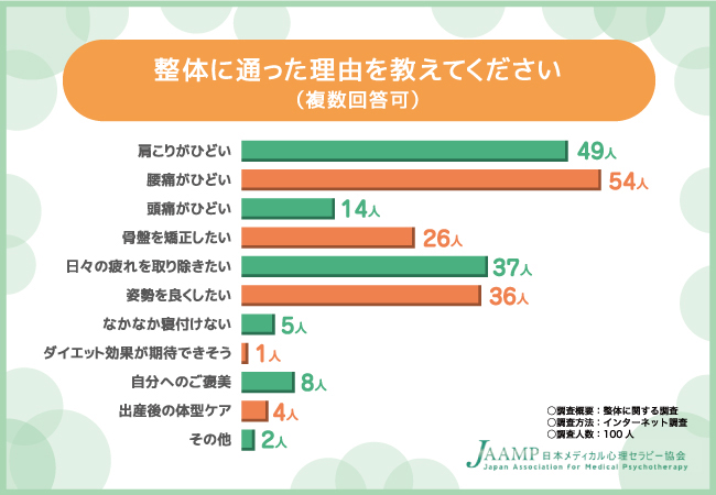 日本メディカル心理セラピー協会(本社所在地:東京都墨田区)は、全国の男女100人を対象に、「整体」に関する調査を実施しました。