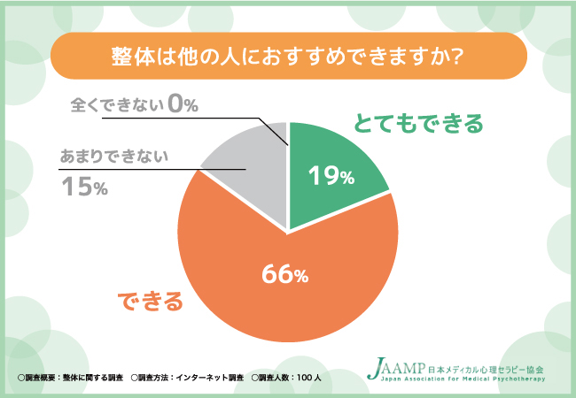 【整体セラピストの資格取得なら日本メディカル心理セラピー協会】8割以上の方が整体で身体の悩みが改善されたと回答!おすすめできると回答した方の割合は?
