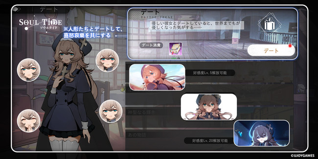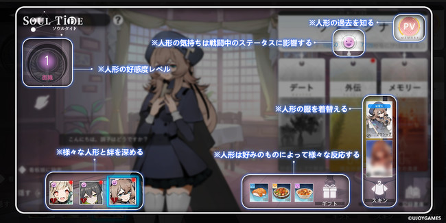 ソウルタイドでは、独自の好感度システムによって、人形と絆を深めることができます。人形の好みのプレゼントを贈ることで絆を上げると、戦闘中のステータスに影響したり、デートをすることも可能です。また、キャラクターには固有のキャラクターソング・PVがあり、眠り人形としてこの世界にやってくる前の、人形たちの過去を覗き見ることができます。中には知られざる凄惨な過去を持つ人形も……。