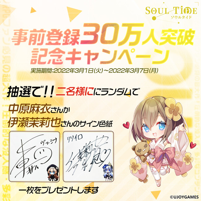 現在、事前登録者数30万人突破を記念して、中原麻衣さん、伊瀬茉莉也さんのサイン色紙(いずれか1枚)が2名様に当たるキャンペーンを開催中!詳しくは『ソウルタイド』公式Twitterをこの機会にぜひチェックしてください!