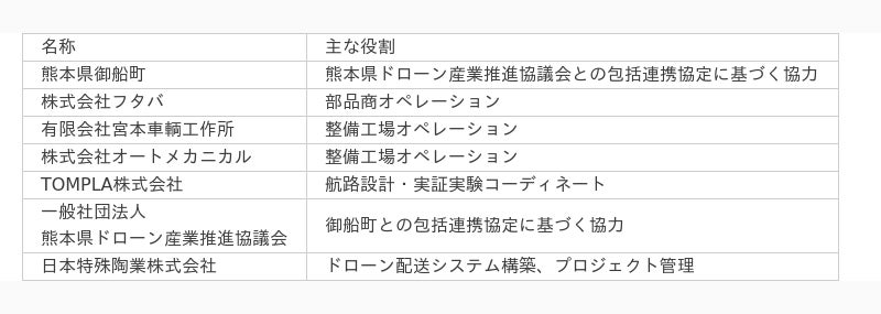 TOMPLA株式会社(社長:藤本 高史、本社:新潟市中央区、以下トンプラ)は、Niterraグループ 日本特殊陶業株式会社(社長:川合 尊、本社:名古屋市東区)、株式会社フタバ(社長:木下 龍起、本社:熊本市南区)と、一般社団法人熊本県ドローン産業推進協議会との包括連携協定を結ぶ熊本県御船町の協力のもと、2024年1月15日から2024年1月18日の間、熊本県御船町にて、自動車整備業界が抱える課題の解決とカーユーザーの利便性向上の可能性確認を目的として、自動車整備工場への部品配送をドローンで行う自動車整備業界初*の実証実験(以下 本実証)を実施しました。