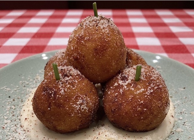 シチリアの郷土料理アランチーニをヒントに作りました。「アランチーニ=小さなオレンジ」という意味ですが、今回はリンゴが中に入っているので小さいリンゴのような見た目にアレンジしています。