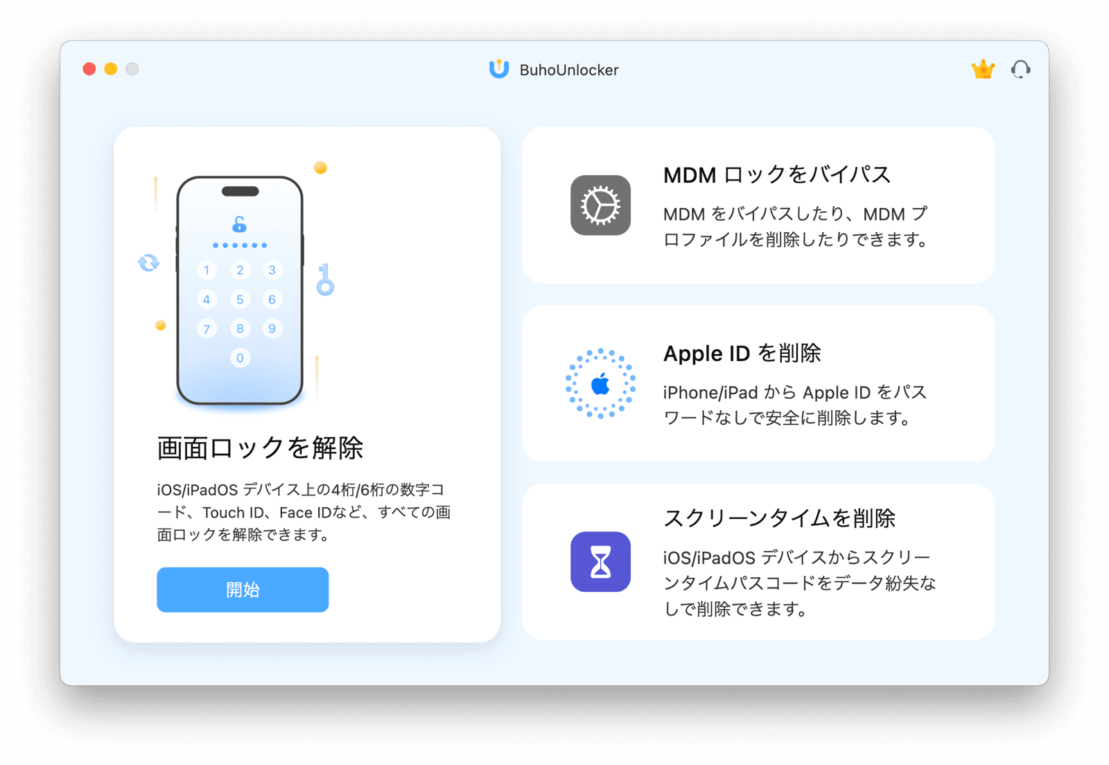 BuhoUnlockerはiPhone/iPad向け、あらゆるもののロックを安全に解除できるソフトです。このソフトであれば、iPhoneの画面ロックを解除したり、スクリーンタイムパスコードを削除したり、MDMをバイパスしたり、Apple IDを削除したりすることができます。iPhoneのパスコードを忘れたら、在宅で自分で処理できます。BuhoUnlocker 公式サイト:https://www.drbuho.com/jp/buhounlocker