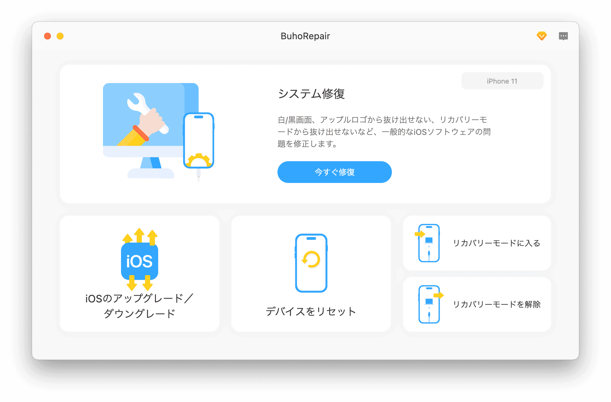 BuhoRepairはiPhone/iPad向けのシステム修復ツールです。例えば、お使いのiPhoneをiOS 26にアップデートした後、不具合が出たら、BuhoRepairで修復できます。これ以外にも、iPhone・iPadがフリーズしたり、Appleロゴの画面で止まったりなど一般的なiOSシステムの問題はBuhoRepairで修正できます。それに、BuhoRepairにはiOSアップグレード/ダウングレード、デバイスのリセット、およびリカバリーモードに入る/解除などの機能も搭載しております。