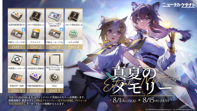イベント期間中、累計ログイン日数が一定に達すると「限定アイコンフレーム【夕月の追憶】、限定プロフィール背景【相因相生】などの報酬がもらえるログインイベント「真夏のメモリー」を開催いたします。