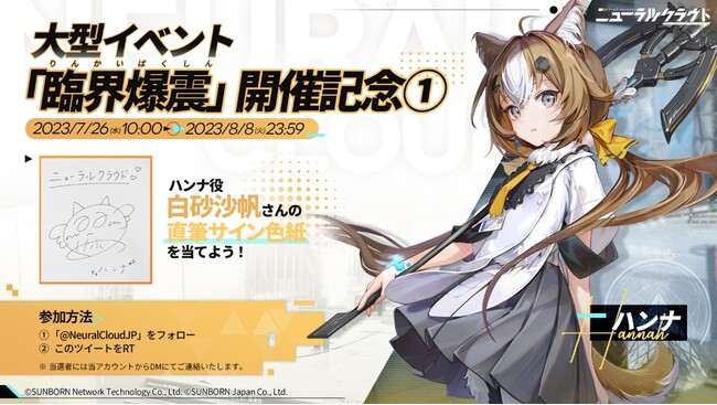 前半では、大型イベント【臨界爆震】で活躍する新人形「ハンナ」のCVを担当していただいている声優の「白砂沙帆」さんのサインが当たるキャンペーンを開催いたします。対象ツイートをRT&公式Twitterアカウントをフォローで応募完了なのでお気軽にご応募ください。