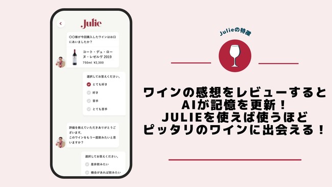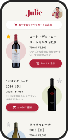 「Julie」は、独自に搭載されたAI機能がユーザーの嗜好を理解し、ひとりひとりにぴったりのワインを提案するECサイトです。初回利用時に簡単な質問に答えることでユーザーの味覚を把握し、数あるワインの中からおすすめのワインを導き出します。また、購入履歴やレビューのデータが蓄積されることで好みがアップデートされ続け、今まで出会うことがなかったワインを紹介してくれることも。多くのユーザーが抱える、数々のワイン選びにまつわる悩みを解決します。