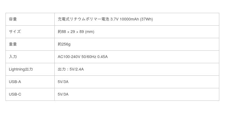 手に収まるサイズ感で大容量の10000mAhと搭載しています。iPhone 12 Pro Max を約2回分、iPhone XS / Xに約3回、Galaxy S10に2回以上、iPad Pro (2018, 11インチ)に約1回、その他ほとんどのスマートフォンに複数回の充電が可能です。