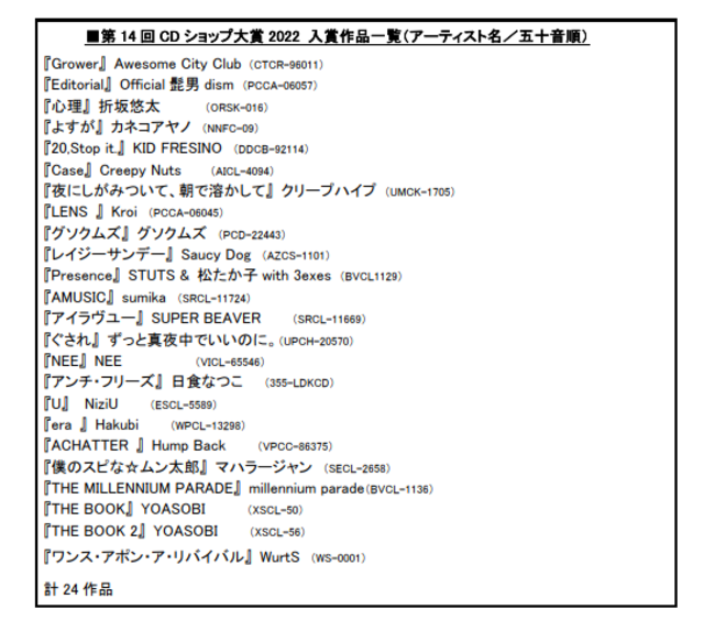 第 14 回 CD ショップ大賞 2022 入賞作品は、2021 年 1 月 1 日〜2021 年 12 月 31 日に発売された邦楽の新譜(ベスト盤を除く)を対象とし、全国各地域の 347 名の CD ショップ店員が投票に参加し投票上位 24 作品を入賞作品として選出いたしました。入賞作品は下記の通りです。
