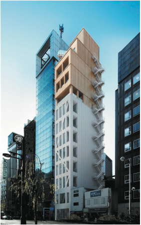 高さ約56メートル、銀座高木ビルの9階から最上階12階部分は、鉄筋コンクリートのビル群の中で浮かぶように見える“木の箱”。東京・多摩地域で生育し、その地区で生産・認証された木材「多摩産材」のスギ材を使用した木造建築です。