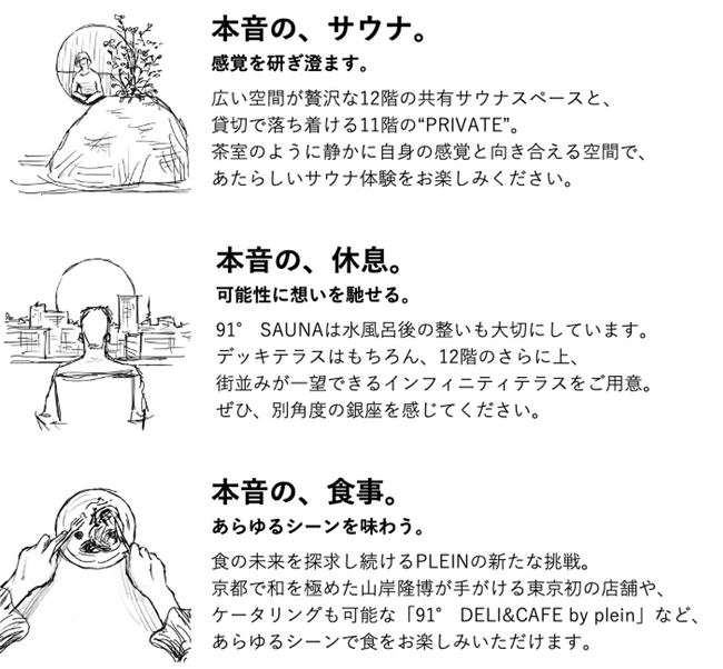 銀座の街並みを一望できるサウナ施設「91° SAUNA銀座」をはじめ、京都で和を極めた山岸隆博が手がける東京初の店舗や、ケータリングも可能な「91° DELI&CAFE by plein」などから成る「SALON 91°」が2023年9月下旬より順次オープンします。