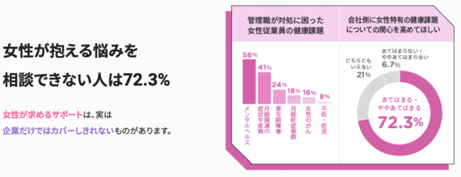 男性の場合は、パートナーシップ、育児に関する悩みやストレスはもちろん、部下を持つ管理職の方に、女性が抱える健康課題を知っておくことが、マネジメントに欠かせないのではないでしょうか。