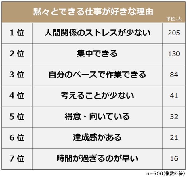 黙々と進める仕事だと人から話しかけられることが少ないため「人間関係のストレスが少ない」「集中できる」といった回答が上位にランクインしました。