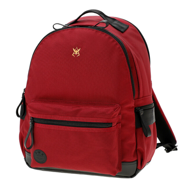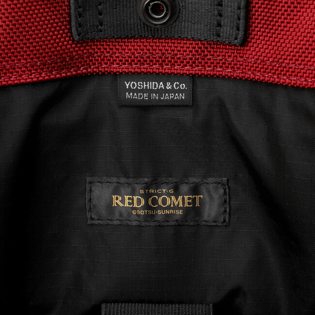 メイン素材に強度に優れた厚手のナイロン生地を採用しています。負荷のかかる底面などの一部分に耐水性や防汚性の高いターポリン生地を使用し、異なる質感の生地を合わせることでコントラストの効いたスタイリッシュなデザインに仕上げています。バッグの前面にシャアパーソナルマークを刺繍で施し、ファスナー引き手に「RED COMET」の文字を素押しで表現したスペシャルアイテムです。