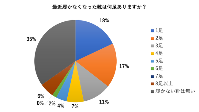 次に実際にどの程度「履かない靴」が存在するのかを問うために「最近履かなくなった靴は何足ありますか?」という質問したところ、「履かない靴は無い」が35%(139人)と1位でしたが、2位は「1足」で18%(72人)、2位が「2足」で17%(70人)、3位が「3足」で11%(45人)、4位が「4足」で7%(27人)と続く結果となりました。つまり1足以上あると答えた人は65%(261人)の6割を超えるユーザーが「履かない靴がある」と回答しております。「誰にでも履かない靴は必ずあるので一概にコロナの影響とは言えません。しかし、引き続きウィズコロナを考慮すると、無駄にならないよう、履かない靴が増えないようにと、消費者心理が進むと予測されます」(トロピックフィールジャパン、マーケティング担当・小川麻織)