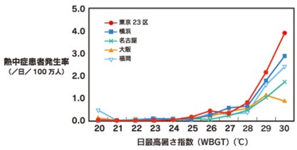 ※グラフは、平成17年の主要都市の救急搬送データを基に日最高WBGTと熱中症患者発生率の関係を示したもの(引用元:環境省 熱中症予防サイト)