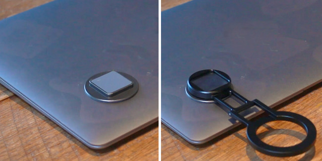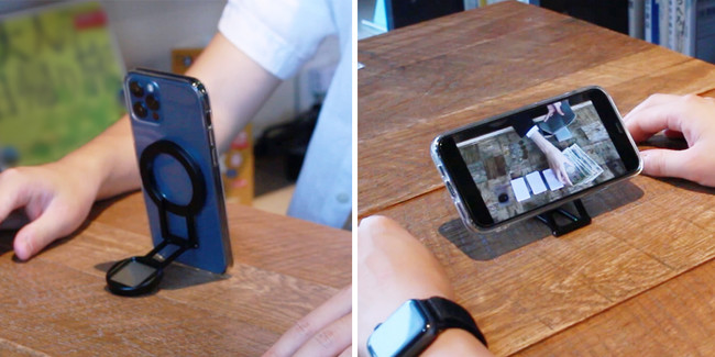 付属のマグネットシールをスマートフォン背面に貼り付ければ「MAGHO setup stand」にスマートフォンを簡単取付できる。