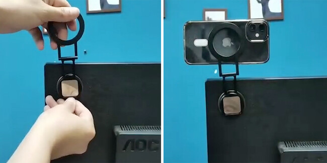 マウントをモニター背面に取り付ければ、デスクトップモニターにもスマートフォンをセットアップできる。