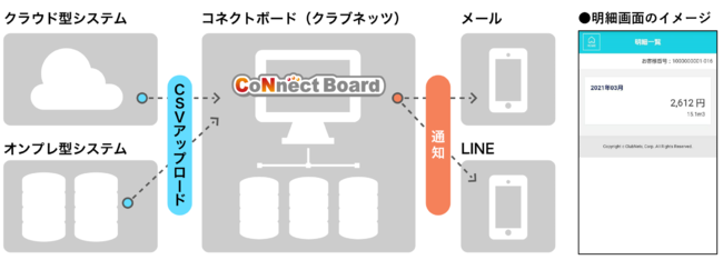 「CoNnect Board」は、ガス企業専門のサポートをしているクラブネッツが提供する、web明細、遠隔督促決済、遠隔商品販売などのサービスパッケージであり、ガス業界のDXをサポートするシステムです。ガス会社が持つ基幹システム等から抽出したデータをアップロードすることで、料金が確定したことが各企業のLINE公式アカウントを通じて通知されます。既存の基幹システムの環境を問わず、効率的な導入を行えます。「αView」は「CoNnect Board」の一機能で、web明細機能を提供しています。 顧客は各企業のLINE公式アカウントを通じてスムーズにweb明細を確認することが可能になります。