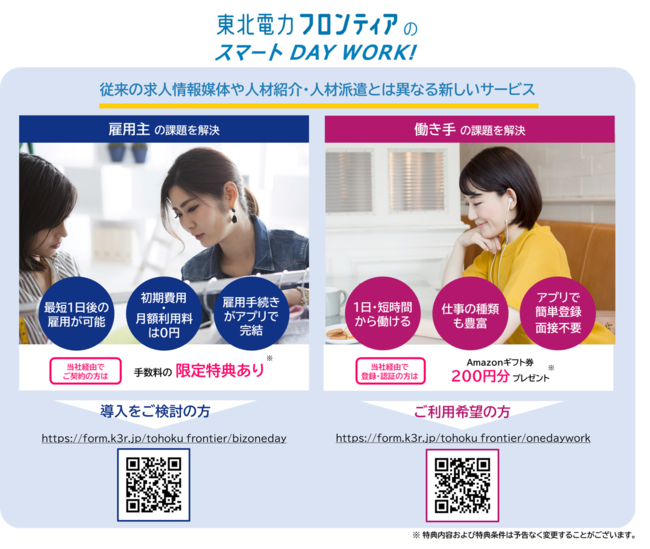 当社は、「東北電力フロンティアのスマートDAYWORK!」として、ワンデイワークが提供する単日・短時間雇用マッチングサービスをご紹介し、人手不足の社会課題解決に貢献してまいります。具体的には、「人手が欲しい企業(雇用主)」と「単日で働きたい方(働き手)」をWEB上でマッチングし、当社経由でサービスをご利用いただいた場合には、雇用主・働き手の双方におトクな特典をご提供いたします。なお、宮城県からサービスを開始し、順次対象エリアを拡大する予定です。
