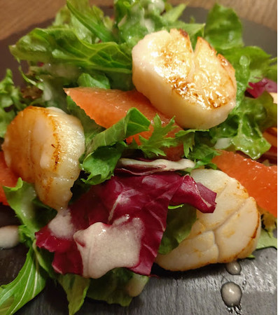 グリルしたホタテとフレッシュなピンクグレープフルーツを自家製のフレンチドレッシングで味わう、さっぱりとした暑い時期にぴったりのサラダです。
