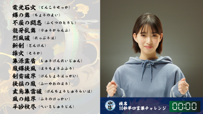 『山海』には「鳳蝶扶風(ほうちょうふふう)」「剣霄破界(けんしょうはっかい)」「玄鳥集雷破(げんちょうしゅうらいは)」といった様々なキャラクターの技名が登場します。今回森川さんには、それらのちょっぴり難読な技名が盛り込まれた早口言葉を、10秒という制限時間内に言い切れるかチャレンジしていただきます。
