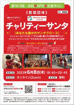 第167回【市民とNPOの交流サロン】サンタクロースに扮したボランティアが小さなお子さまへプレゼントを届ける団体=『チャリティーサンタ』が登壇します。