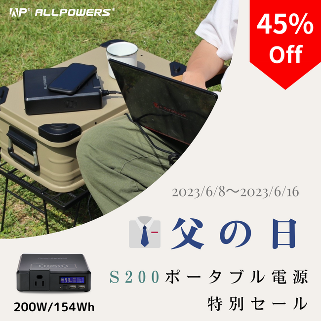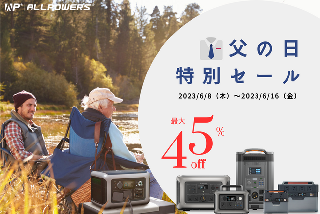 ポータブル電源とソーラパネルの開発から販売までを手がけ、お客様に応じた適切なソリューションを提案しているALLPOWERS(オールパワーズ)株式会社は、2023年6月16日(金)まで、Amazon公式ストアと公式サイトにて「父の日特別セール」を開催いたします。ALLPOWERSポータブル電源とソーラーパネルの全シリーズ商品が最大45%OFFのセール価格で販売されています。父の日当日までにお届けできるので、プレゼントをお求めの方はこの機会をお見逃しなく。
