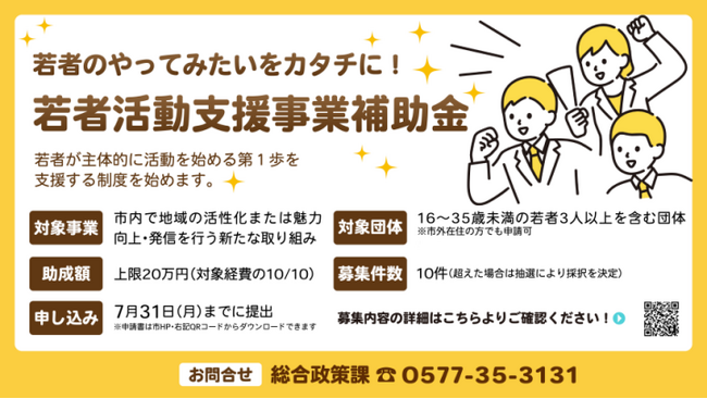 この制度は、16歳〜35歳未満の若者3人以上を含む団体が、新たに行う地域の活性化または魅力向上・発信を支援するものです。助成額は上限20万円で、対象経費の10/10を補助するものです。