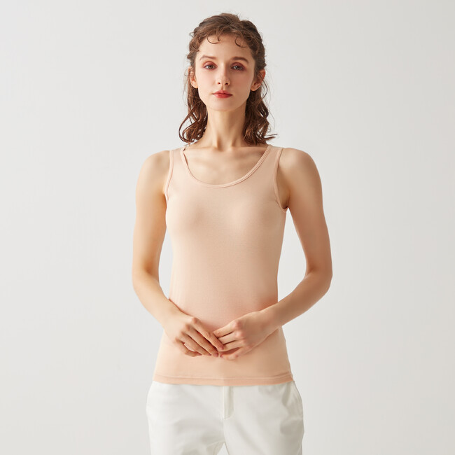 1年通して着用できる本体コットン100%素材のタンクトップは、ワードローブと相性の良いシンプルなシルエット。身頃には脇はぎが無いので、ごろつきにくく、肌への刺激を軽減。コットンのやさしい着心地。