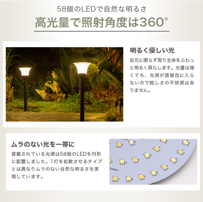 58灯ものLEDが自然な光を演出し、お庭の雰囲気を一段と素敵に演出します。