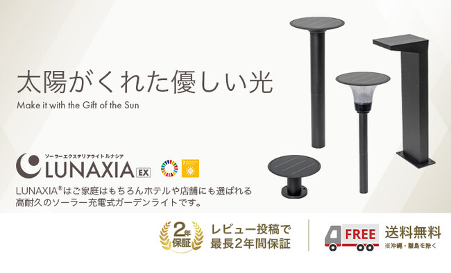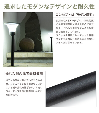 「LUNAXIA EX」とは、同社の好評シリーズ「LUNAXIA」のセカンドラインです。LUNAXIAはソーラーライトの持つ安価なイメージを払拭したハイエンドなエクステリアライト。そのLUNAXIAから高機能と高級感を継承した商品を「EX」として展開していきます。