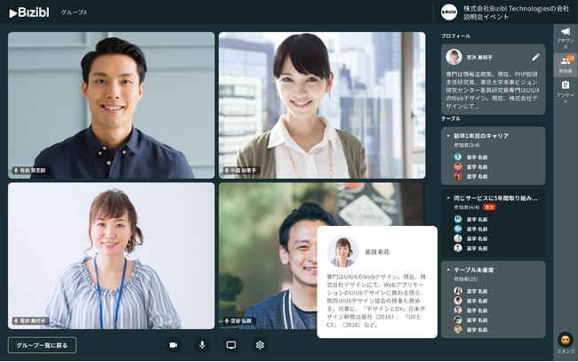 「Bizibl」は、告知からイベント配信、参加者データ管理までをワンストップで実現する、オンラインイベントの開催プラットフォームです。採用イベントやマーケティングウェビナーでの活用を想定しており、継続的なイベント運用の業務工数を減らすとともに、イベントに最適化された配信画面により、参加者のエンゲージメントを高めることができます。また、参加者の行動/属性データを蓄積できるため、参加者情報の資産化や、詳細なイベント分析を可能とします。