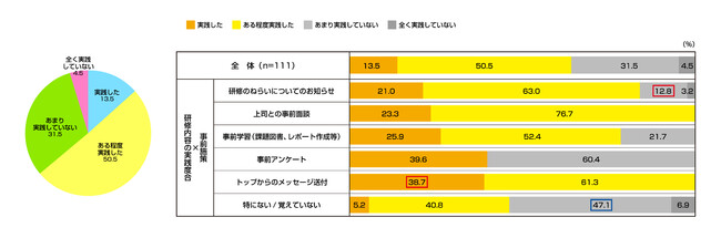 逆に、事前施策について「特にない・覚えていない」とした受講者は、「実践した」が明らかに低く、「あまり実践していない」とする回答比率が高い。
