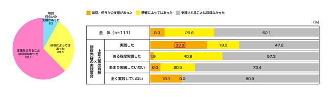 「支援をされることはほぼなかった」(62.1%)が最も多く、全体の6割となった。「研修によってはあった」(29.6%)が続き、「毎回何らかの支援があった」(8.3%)は1割以下となった。